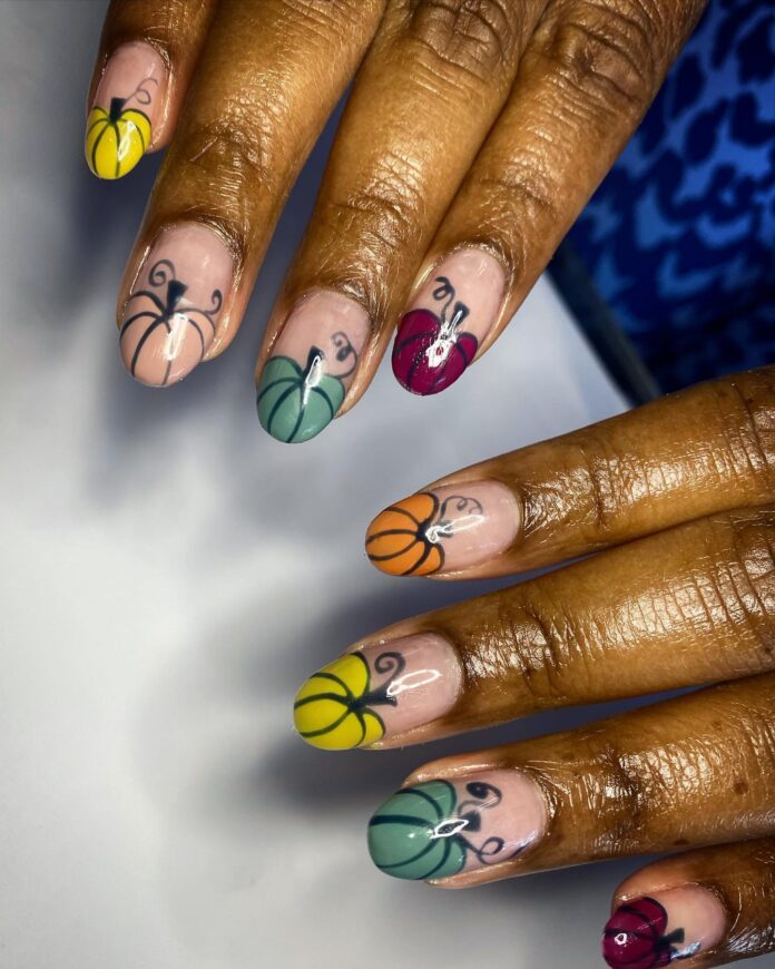 Bet you never thought you could love pumpkins on a set of nails so much. To try this design at home, start with a neutral-toned base and then choose five other autumnal hues that will form your pumpkin, like the gorgeous shades in Olive & June’s Fall Box.