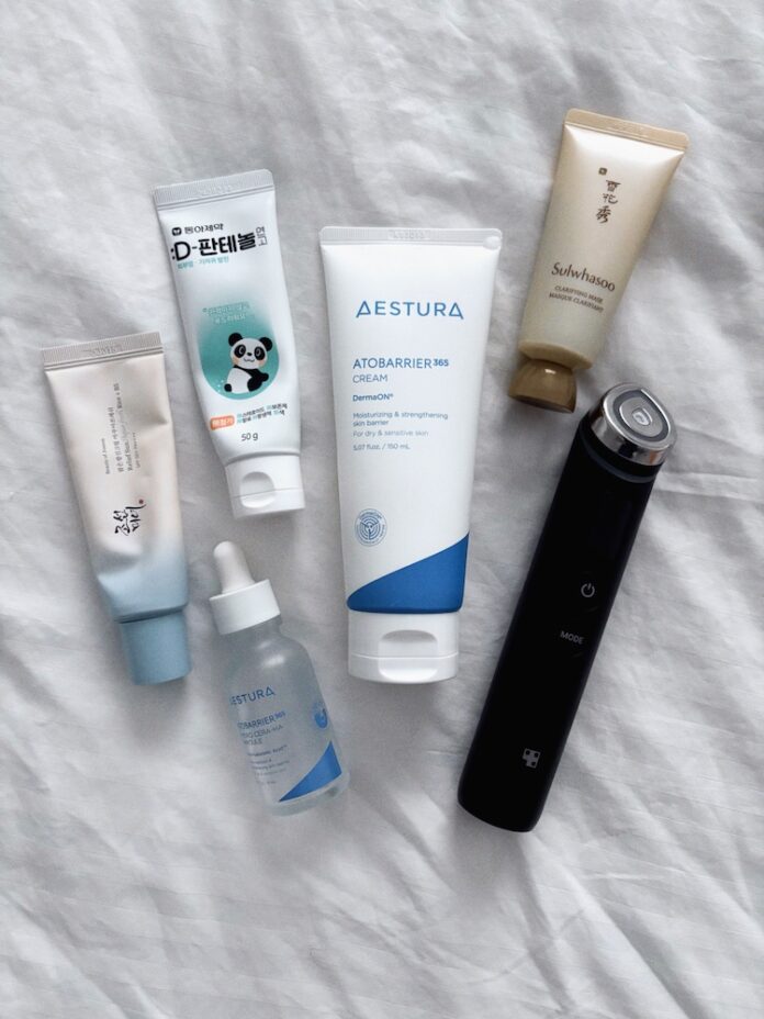 Before I travel, I usually do my nighttime skincare routine regardless of the time because I know it’s going to be extra dry on the plane. The main star is Aestura’s Atobarrier 365 cream. It’s been the number one winter cream in Korea for six years straight. I purchased it on my last trip to Korea actually. It’s amazing. And I have a little hard case kit that I always take with me. It has Beekeeper’s Naturals propolis throat spray so you don’t get sick, Laneige lip balm, Tamburins hand lotion, Purell, and Huxley face mist. I also had my Beauty of Joseon Relief Sun Aqua-Fresh SPF, Sulwhasoo Clarifying Mask, Medicube, and Aestura Atobarrier 365 Hydro Cera-HA Ampoule with me.