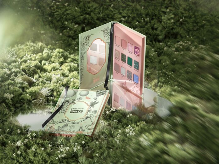 Today, her brows are complemented with a wash of duochrome eye shadow across her lids that shifts from pink to silver depending on the light—it’s “Save Me This Dance?” from the Ozdust Eyeshadow Palette ($55), Grande tells me. The shade names (like “Thrillifiying!” and “Darlingest”) are “all very specifically and Wicked-ly Ozian,” she says. “There’s lots of Galinda-ified language.”