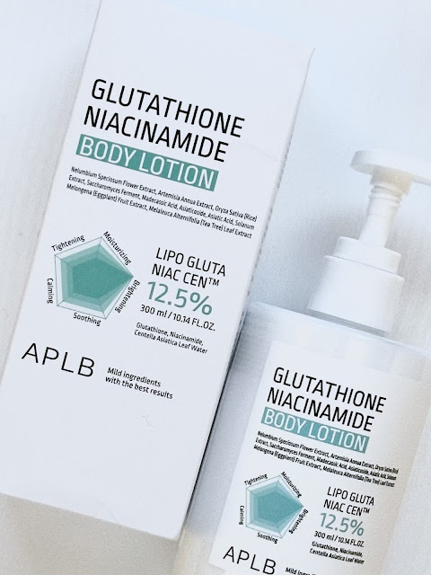 While APLB has a host of face products products that I would love to try eventually, today we are focused on their fragrance-free body lotion which contains the brightening ingredients: beta glucan, niacinamide (1000ppm = 0.1%) and glutathione (1000ppm = 0.1%). This might seem like a low percentage compared to the 1-10% concentrations we have seen in facial products, but the higher concentration can be irritating to more sensitive skin types. Even my skin, which is pretty tough, gets red if I use a 5% niacinamide serum every night.