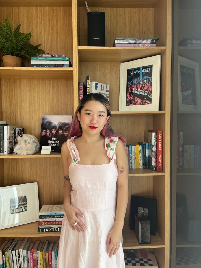 A side profile photo of Allure commerce editor Sarah Han wearing Cakes Sticky Cakes Circles underneath a light pink dress