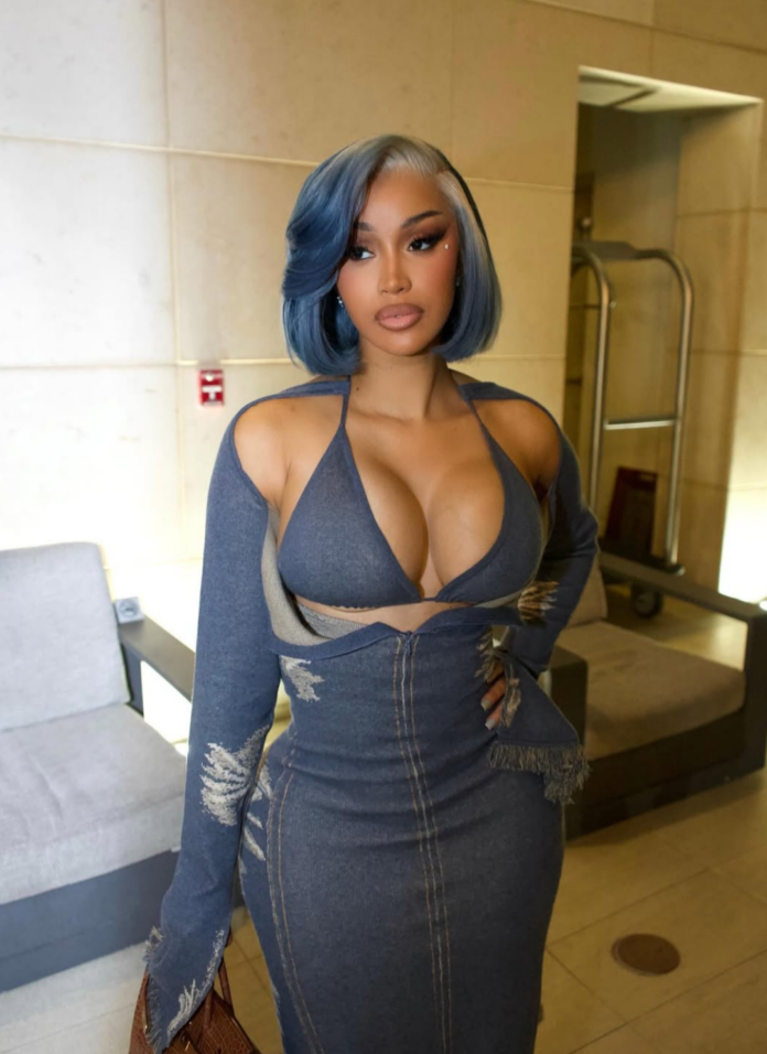 You already know Cardi doesn’t do subtle. The outfit paired with her new blue hair was a full vibe. She stepped out in a distressed denim look with skin showing in all the right places, paired with metallic heels and stacks of cash in hand. Her glam was just as snatched — think sharp brows, fluttery lashes, glossy nude lips, and sculpted cheeks. It all came together in true Cardi B fashion — over the top, yet perfectly executed.