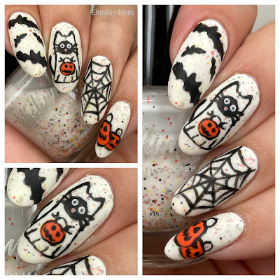 These were inspired by a mug I saw at Home Goods! I snapped a pic of it but have no idea of the designer, whoops! It was just the scene with the cat, a spider web, and bats, so I spread it across my nails and added extra pumpkins on my pinky!