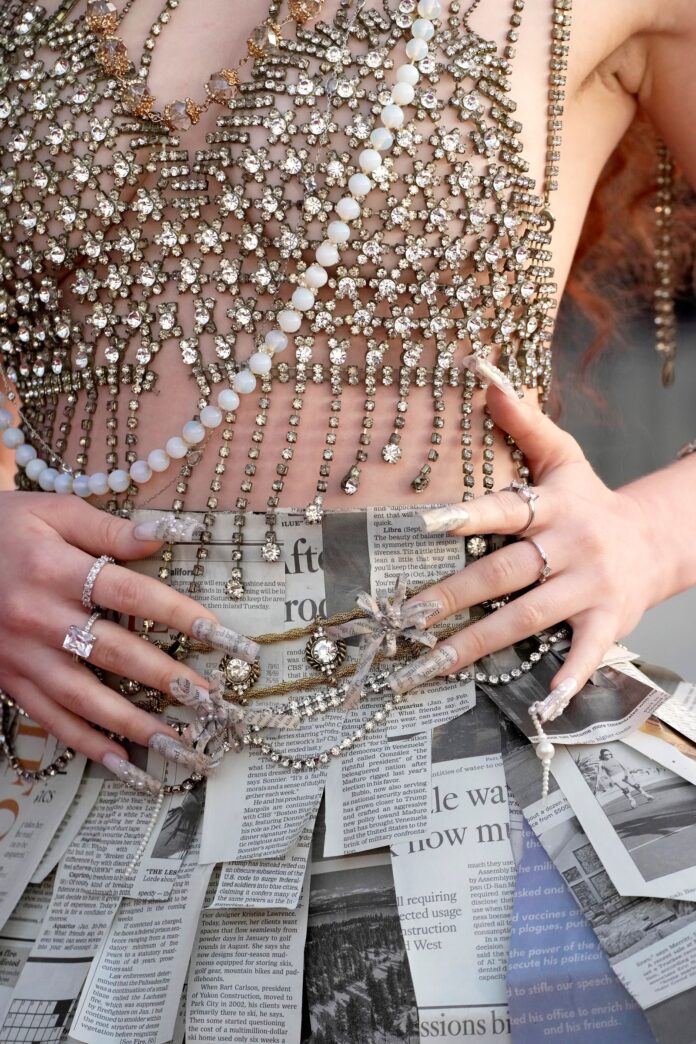 Roan, who inducted Lauper into the Rock & Roll Hall of Fame, channeled the star in an outfit inspired by two separate scenes from the “True Colors” music video, including a newspaper skirt made of long, fluttering strips of newsprint by Efrain Nava and an enormous, showgirl-esque bedazzled headpiece. She mimicked the newsprint pattern on her nails, with teeny strips of newsprint applied to each nail in varying patterns.