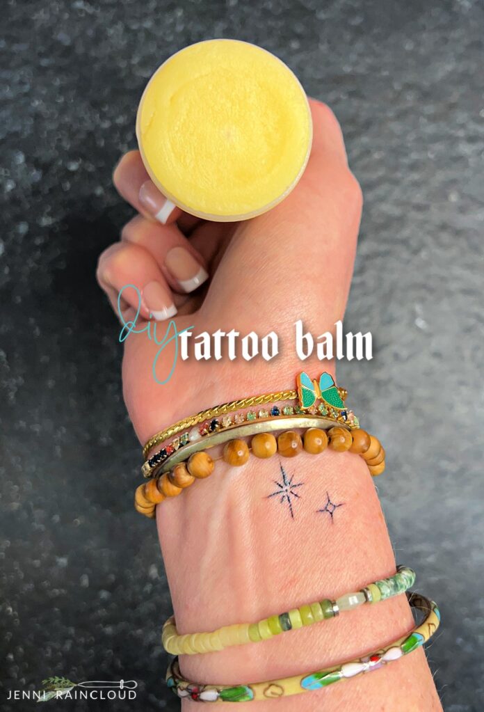 I’m not a tattoo expert but I do have a few tattoos and a couple I just recently had done. In typical Jenni Raincloud style, I come up with recipes as I personally need them which is also true with my saline solution for ear piercing post. I’m on a piercing/tattooing kick (could be a mid-life crisis) so of course I have to share my new recipe for a natural tattoo balm. Fresh tattoos leave you with sensitive skin and proper tattoo care is a must for several weeks after. Applying a thin layer of a protective barrier will help preserve the vibrancy of your tattoo.