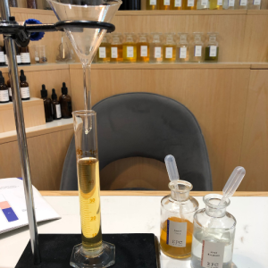 After sitting down at the organ, you have an initial chat with your host, who will ascertain what fragrance you like or are looking for. You will then be given the three Essential top notes to try on blotters and be asked to choose one. This is repeated with the heart and base notes. There are no wrong choices as all the blends have been designed to work together. Your selection will determine which two Signature Blends your host will suggest. One will be sprayed on your right wrist, the other on your left. You can then opt for one. It’s no easy task. But once decided, a measuring tube is rinsed with ethanol and after you have donned lab coat and safety glasses, you are invited to pipette the desired measure of each of the Essential blends into the measuring tube. This is then decanted into a bottle for you. Oils are replaced every week and are poured at 28%+ concentration, so not only is the quality of the fragrance exceptional, but at extrait strength, the longevity is too.