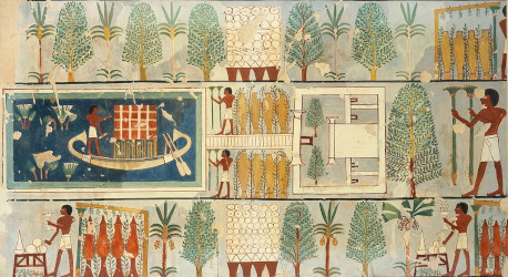 Note: top image is Funeral Ritual in a Garden, Tomb of Minnakht, ca. 1479–1425 B.C, facsimile painted at the tomb in 1921 by Charles K. Wilkinson, via Metropolitan Museum of Art, public domain. “This facsimile painting copies a section of wall painting in the tomb of Minnakht (TT 87) in western Thebes. The scene depicts a garden surrounding a building with a large pool in front of it. In the lowest register, two men stand in front of small offering tables. Each man pours a libation with one hand and holds a brazier with burning incense in the other.”