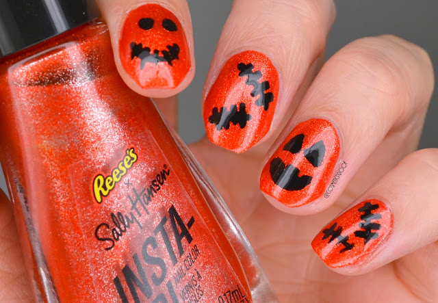 I did not get a chance to use this gorgeous metallic orange polish, “REESE’S Candy” from Sally Hansen’s Reese’s Piece’s Halloween collection from last year so I have literally been sitting on it and waiting for October bring it out. It was actually a beautiful ONE COATER, but of course I had to do my two coats for good measure. What a fantastic bronze-y orange for the Fall season! I almost left it blank, but I think the week of Halloween needs some Halloween vibes so I hand-drew some stitches and faces with black acrylic paint.