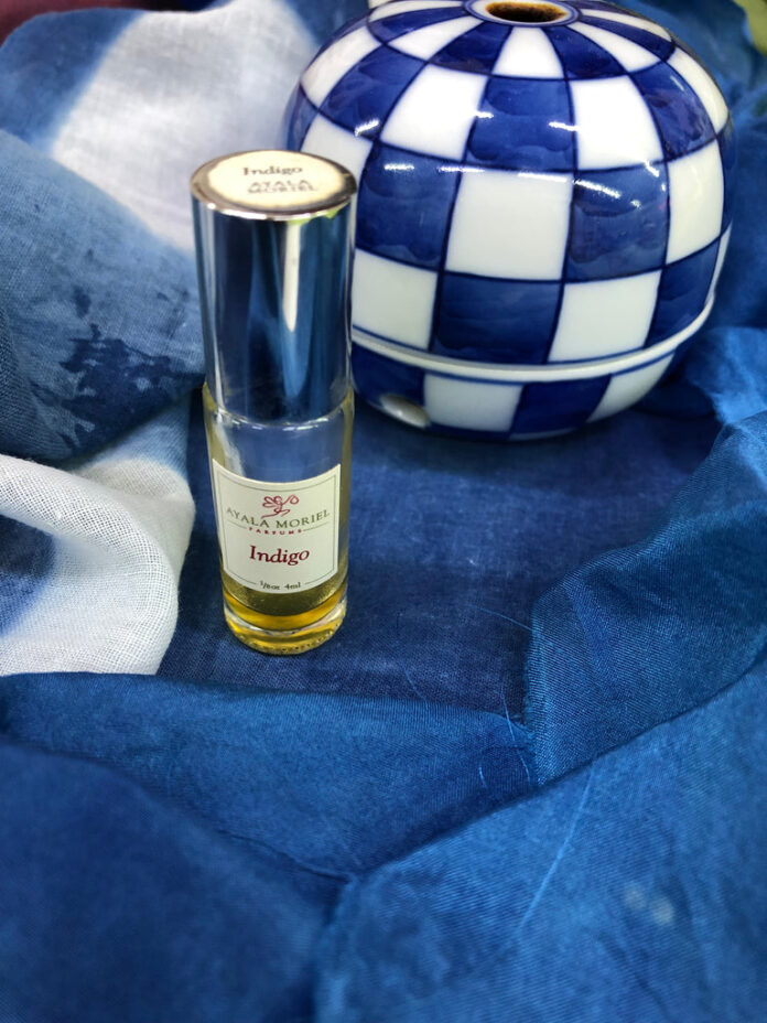 Indigo perfume was created long before I had any notion of the process of indigo dyeing, or its smell. It is more of a translation of that mysterious colour, the deep dark blue, similar to that “blue hour” referenced in Guerlain’s famous perfume. The inspiration for this was my mother, and her velvety hug, soothing and soft. Before leaving for Canada, she gave me one of her blouses, a blue velvet hoody that helped me remember that hug and feel close to her even beyond many continents and oceans. That particular fabric is cool to the touch but very soft and also reminds me of my mother’s personality, forever flickering between warmth and coolness.