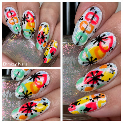 I just love the idea of the nail polish is popping against the shimmery base. I used a mix of neons and basic primary colors with the black cream. It created a stark contrast. The black polish was used for stars and different sort of symbols that just play against the random shapes of the bright nail polishes. Like I said this was a combination of manicures I saw on Pinterest so there really was no rhyme or reason beyond a bunch of shapes.
