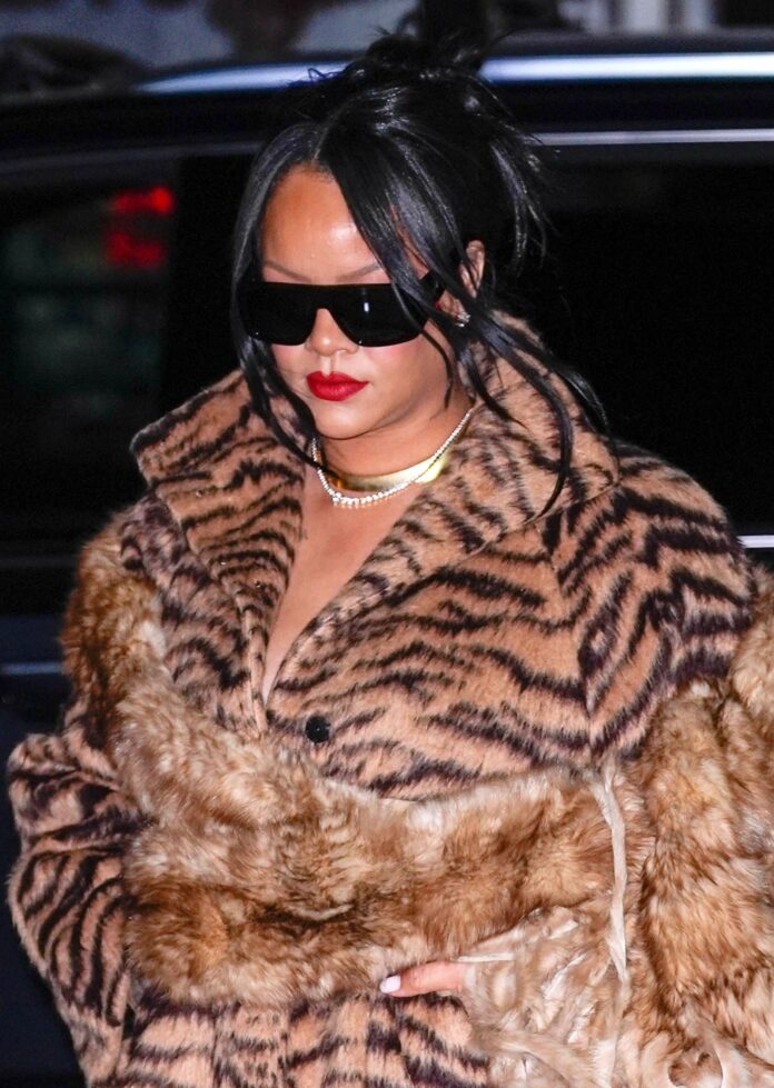 And in the case of Rihanna in 2026, it looks undeniably awesome with a very mob-wife ensemble: head-to-toe tiger print in the form of a nearly ankle-length fur coat, matching heels, and a cascading fur stole. (Whether or not they’re real, I cannot be sure.) She layered a gold choker under a slightly longer diamond necklace, and hid any eye look she might have been wearing under dark sunglasses.