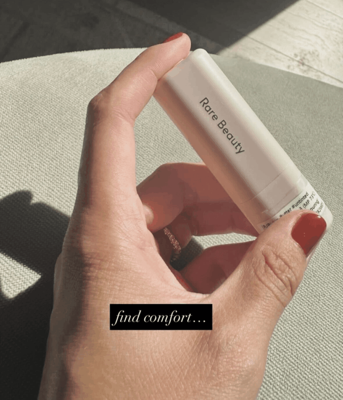 We also couldn’t help notice that Gomez appears to be holding between those two beautifully polished fingers a Rare Beauty lab sample. Her thumb quite deliberately covers most of the label on what seems to be a stick-format product, but we can make out what appears to say “Lip Butter #untinted.” Ooooooooooh!