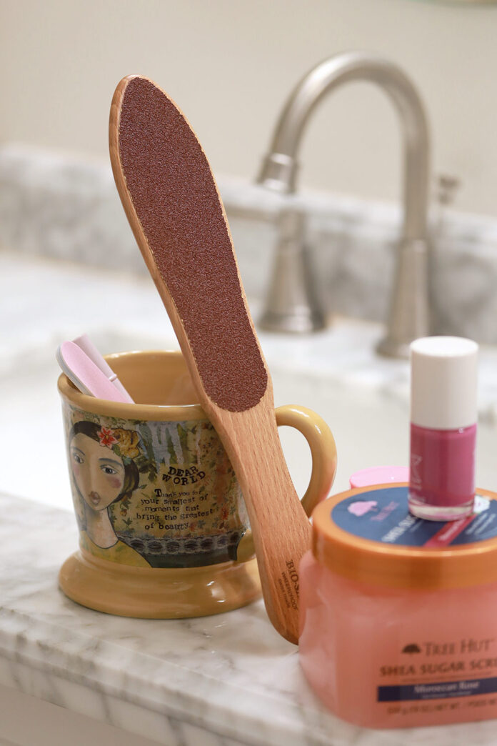 I like to soak for 10 minutes, and then I start with the rough side of the file to get the bulk of the thick skin off. Then I do some “fine tuning” with the side with the finer grit.