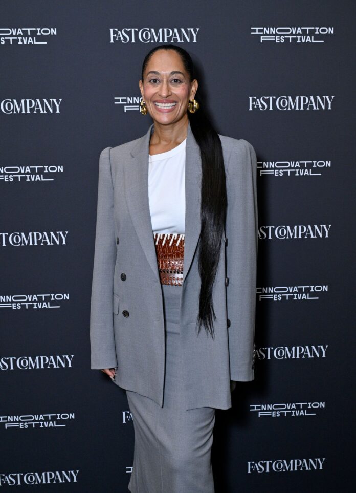 Ross spoke at the Fast Company Innovation Festival on September 18 in a gray oversized blazer and matching flared pencil skirt that screams, “Why yes, I am intimately familiar with that C-suite life.” But Ross being Ross, her stylist Karla Welch, added in those Tracee touches like a wide, multi-texture, brown belt and a white tee.