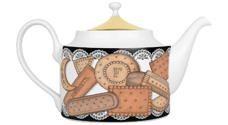 Note: “Harrods’ 175th anniversary is a time for celebration, and Fornasetti takes playful approach to the festivities with the Biscotti print: after all, what’s more British than tea and biscuits? This porcelain teapot is infused with the Italian label’s tongue-in-cheek attitude, the body printed with tasty treats atop a lace doily that bear the two brand’s monikers in a statement of premium sensory experiences.” £590 at Harrods.