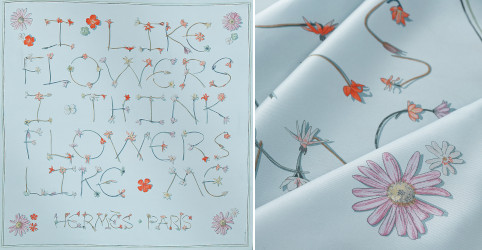 Note: the 26″ square I Like Flowers 70 silk scarf in azur / corail / vert amande is $415 at Hermès.